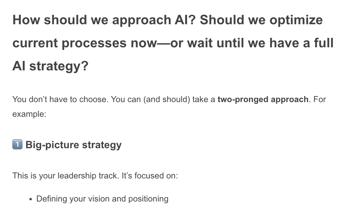 The outcomes of these two approaches may look similar. But by adopting a prompt library system that aligns with your current workflow, you can more seamlessly – and more effortlessly — incorporate AI into your day-to-day work.